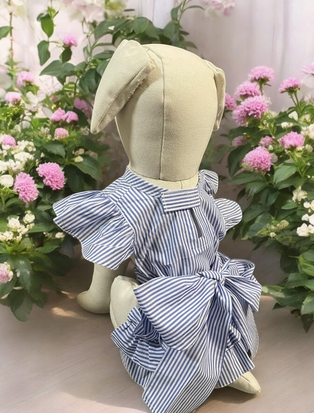 着せ楽フリルドレス(ブルーストライプ)は、ワンちゃんの首にかけて胴回りのリボンを回すだけのエプロンタイプなので、洋服を着るのが苦手なわんちゃんでも楽に着せることができます。 デザインもフリルが可愛らしく爽やかなブルーストライプので、愛犬のお洒落さを引き立てます。 ふんわりとしたシルエットとさらっとした木綿の生地で、動きやすさも追求しました。 このドレスを身にまとった愛犬の姿を見ると、愛らしさと幸せを感じることでしょう。大切なパートナーとの特別な時間を共有しませんか? ※サイズにつきましては、商品ページのサイズチャートをご確認ください。洗濯時の注意点もご一読いただき、長くお使いいただけるようにお願いいたします。